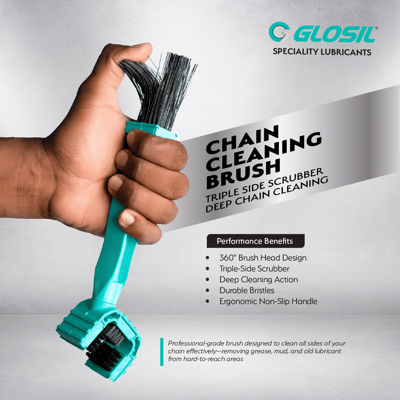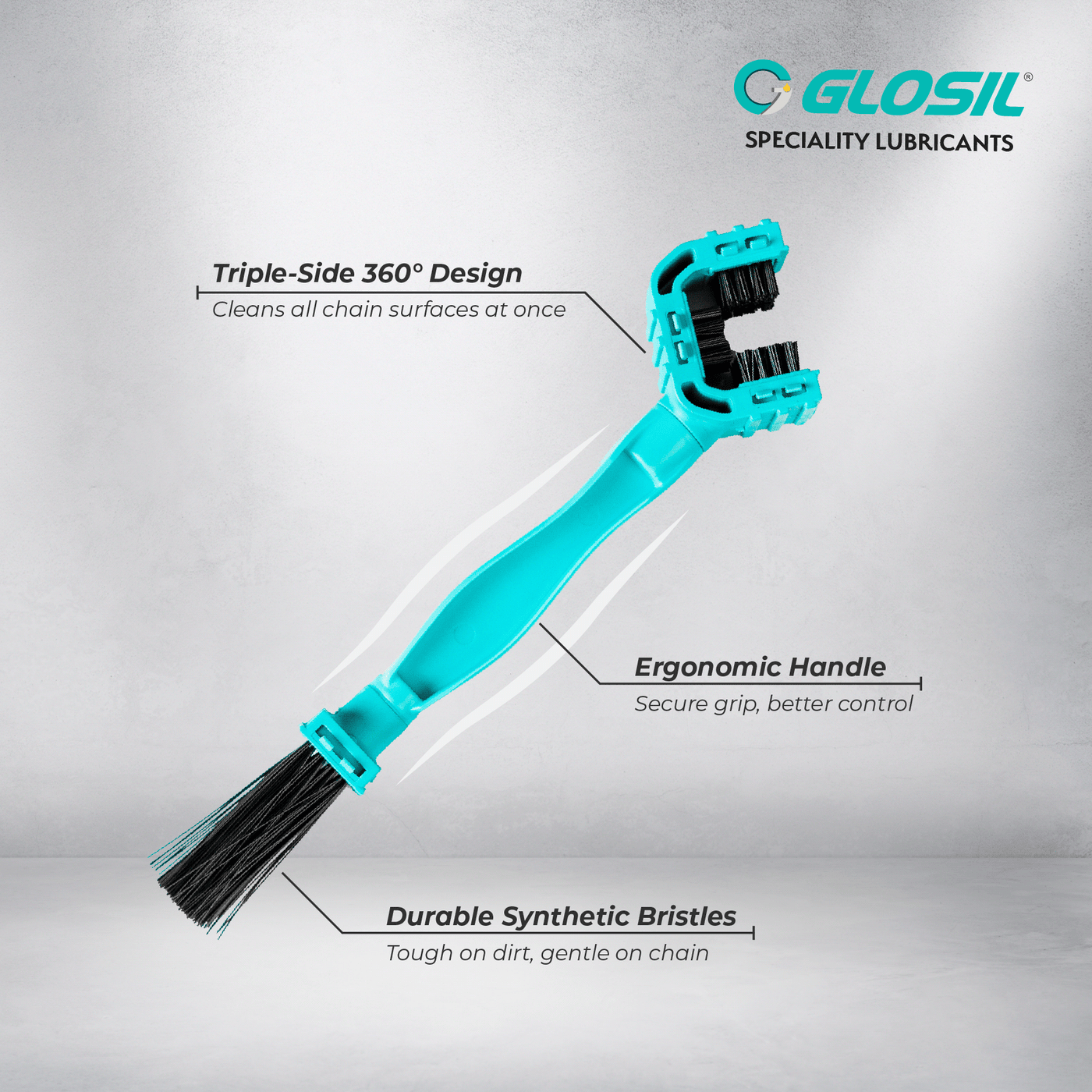 The Glosil Bike Chain Cleaning Brush is a professional-grade tool designed for thorough and efficient chain maintenance. Its triple-side, 360-degree brush head allows complete access to all chain surfaces, ensuring effective removal of dirt, mud, grease, and old lubricant in hard-to-reach areas. The durable bristles provide deep cleaning without damaging the chain, while the ergonomic handle offers a secure and comfortable grip during use. Ideal for regular maintenance, this brush helps prepare the chain for lubrication, reduces wear, and extends overall chain life across all types of bikes.