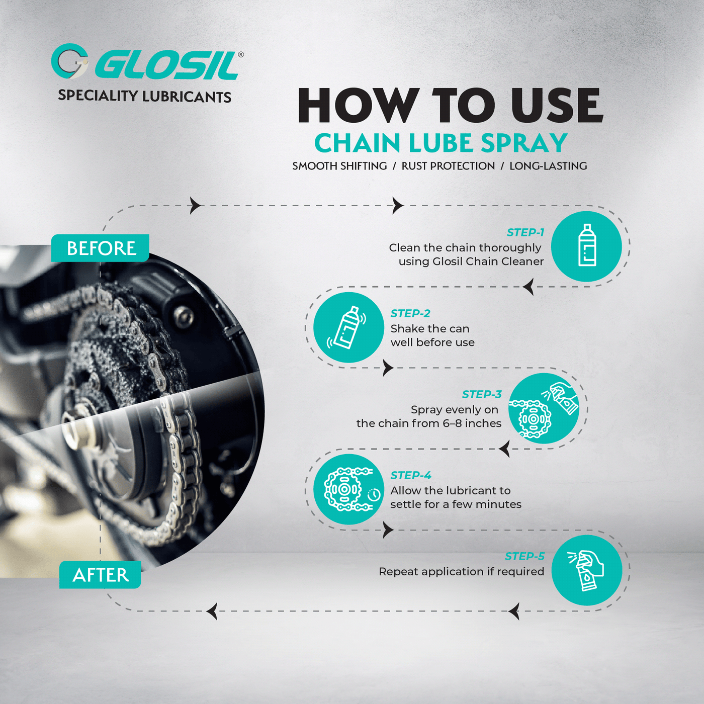 Glosil Chain Lube is a high-performance, all-weather motorcycle chain lubricant engineered for smooth riding and long-lasting protection. Its advanced, water-resistant formula penetrates deep into chain links to reduce friction, minimize wear, and protect against rust and corrosion in both wet and dry conditions. By reducing drivetrain stress, it improves power delivery and extends chain life. Suitable for all two-wheelers—from daily commuters to performance motorcycles and chain-driven EV two-wheelers—Glosil Chain Lube delivers reliable performance year-round.