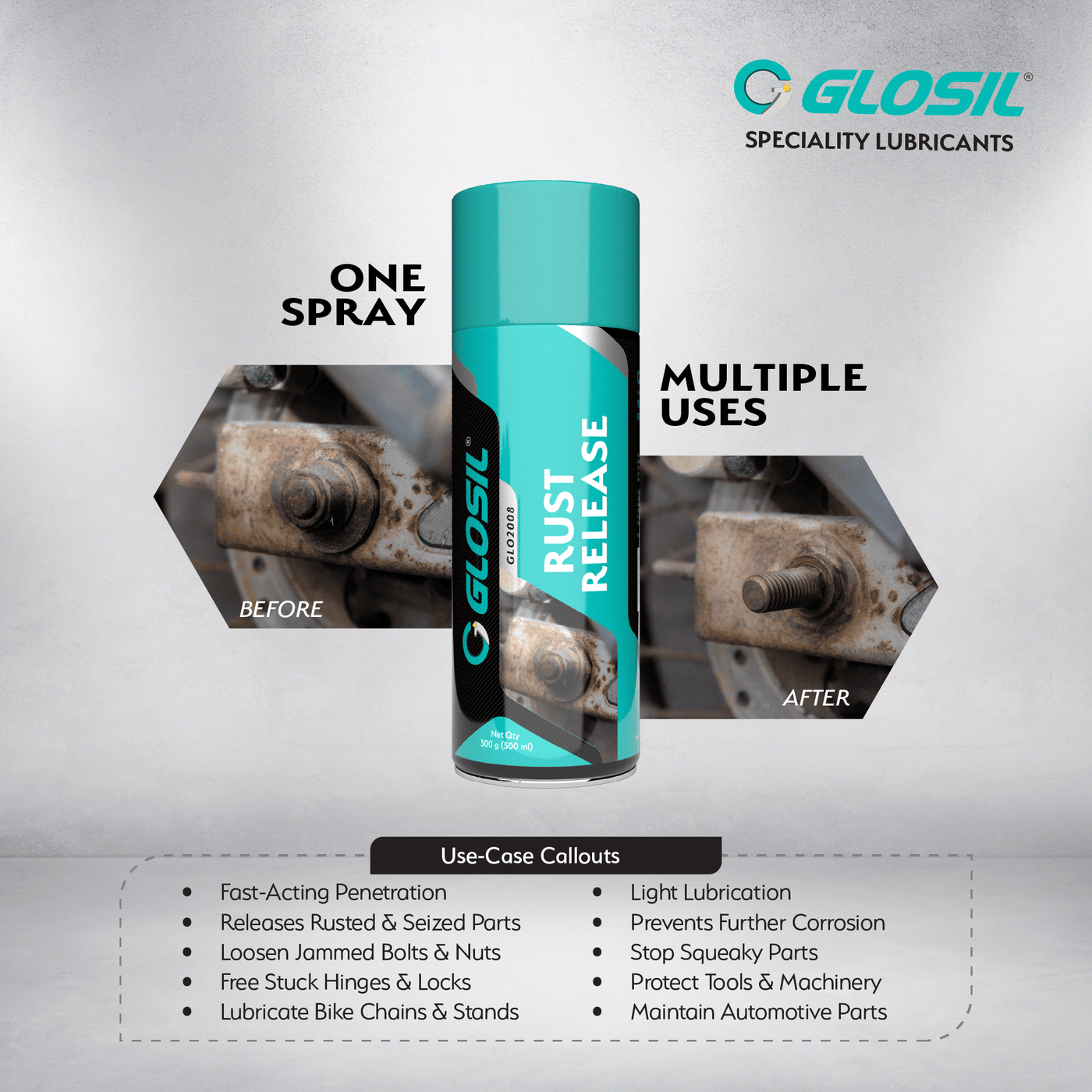 Glosil Rust Release Spray is a versatile, fast-acting maintenance solution designed to free stuck, rusted, or seized components with ease. Its penetrating formula seeps deep into corroded surfaces to loosen rust, reduce friction, and restore movement to metal parts.