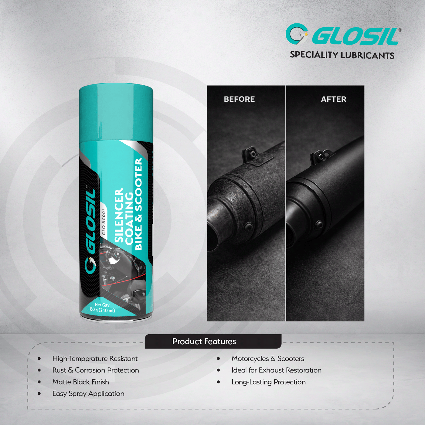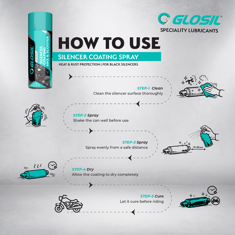 Description: The Glosil Silencer Coating Spray is designed to protect and restore motorcycle and scooter exhaust systems exposed to extreme heat and harsh riding conditions. Its high-temperature resistant formulation creates a coating that helps prevent rust, corrosion, and surface deterioration.