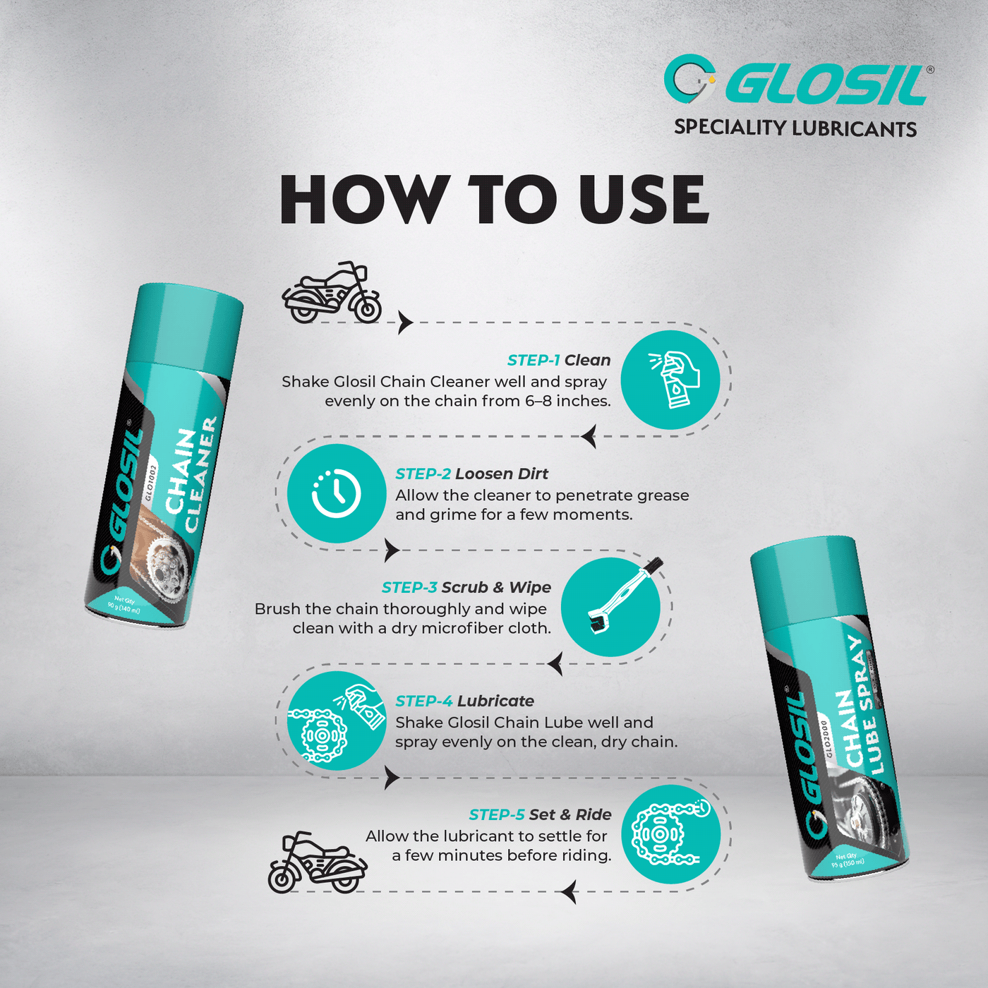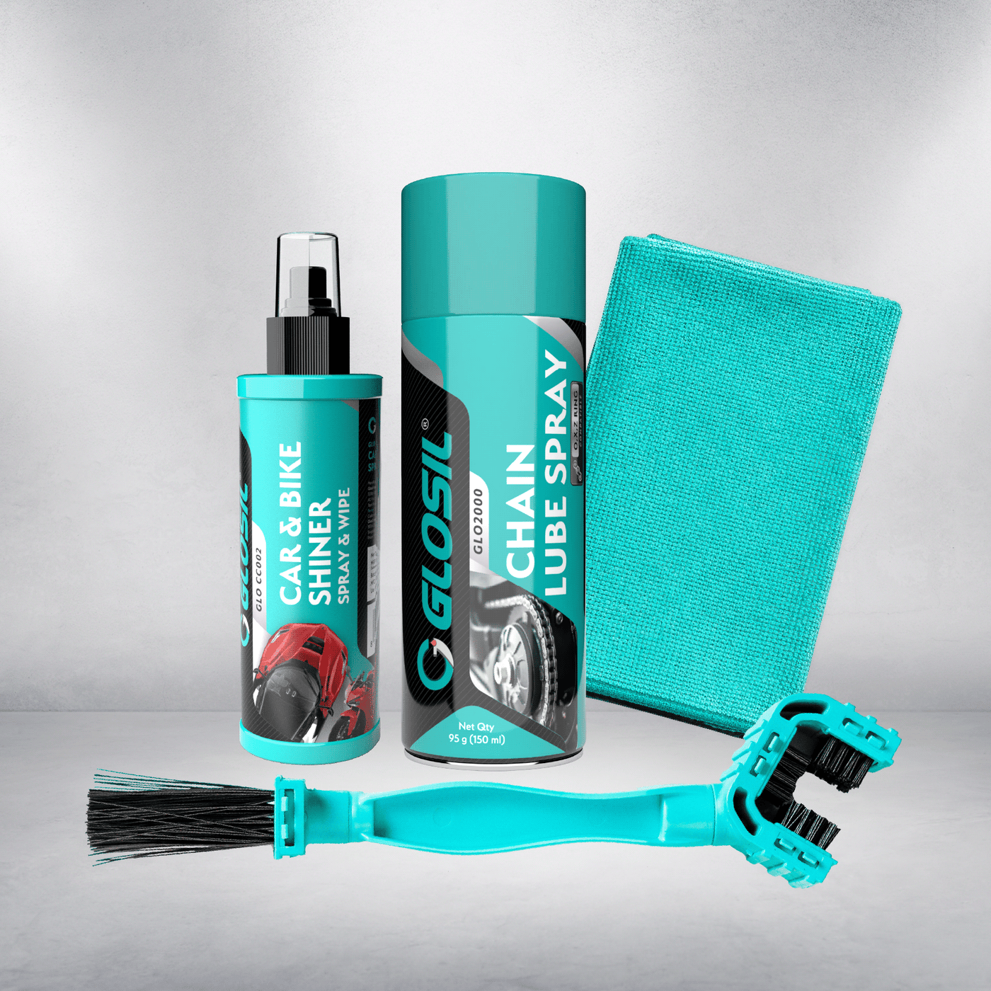 Glosil Motorcycle Chain Maintenance Kit | Chain Lube 150ml, Bike Shiner 100ml, Chain Cleaning Brush & Microfiber Cloth
