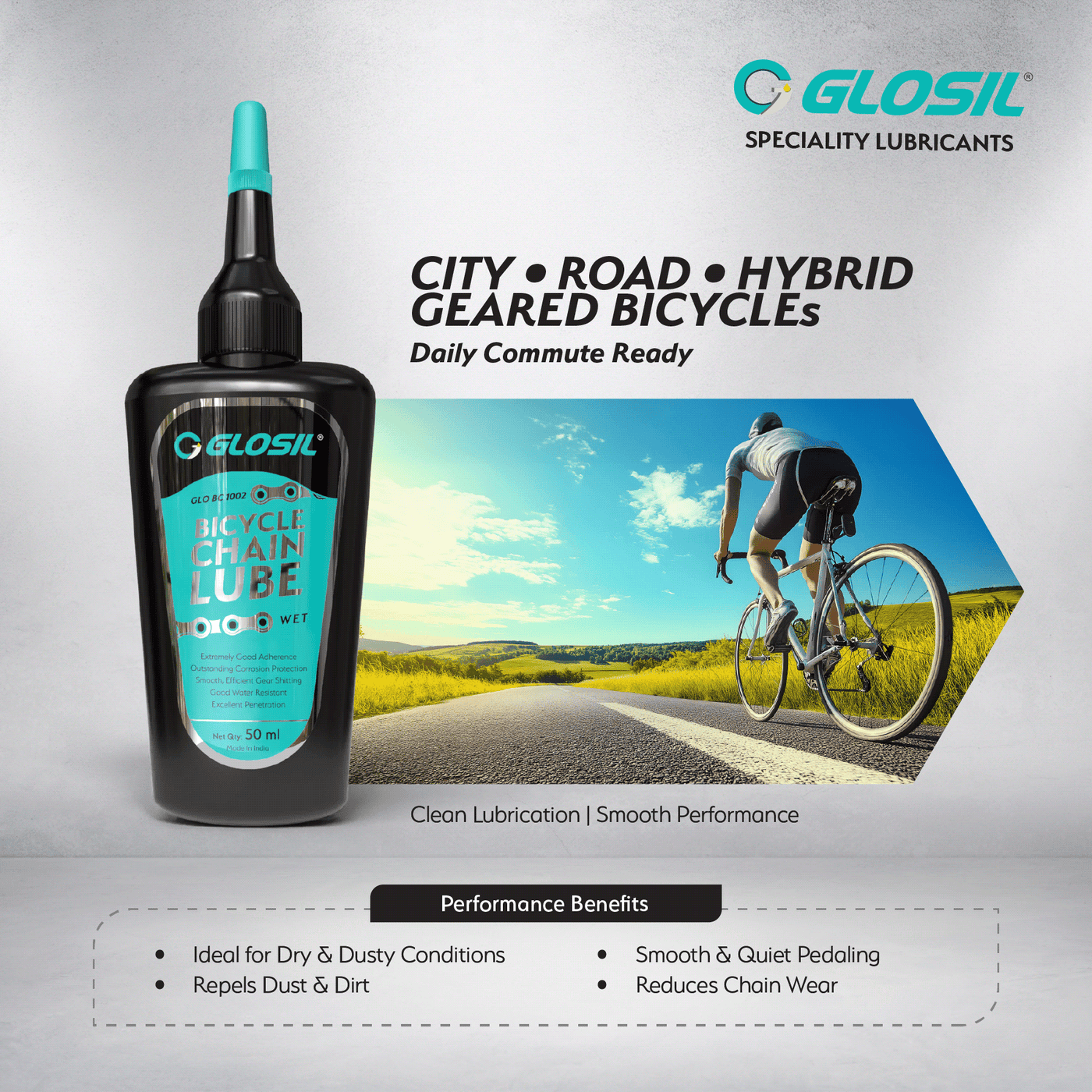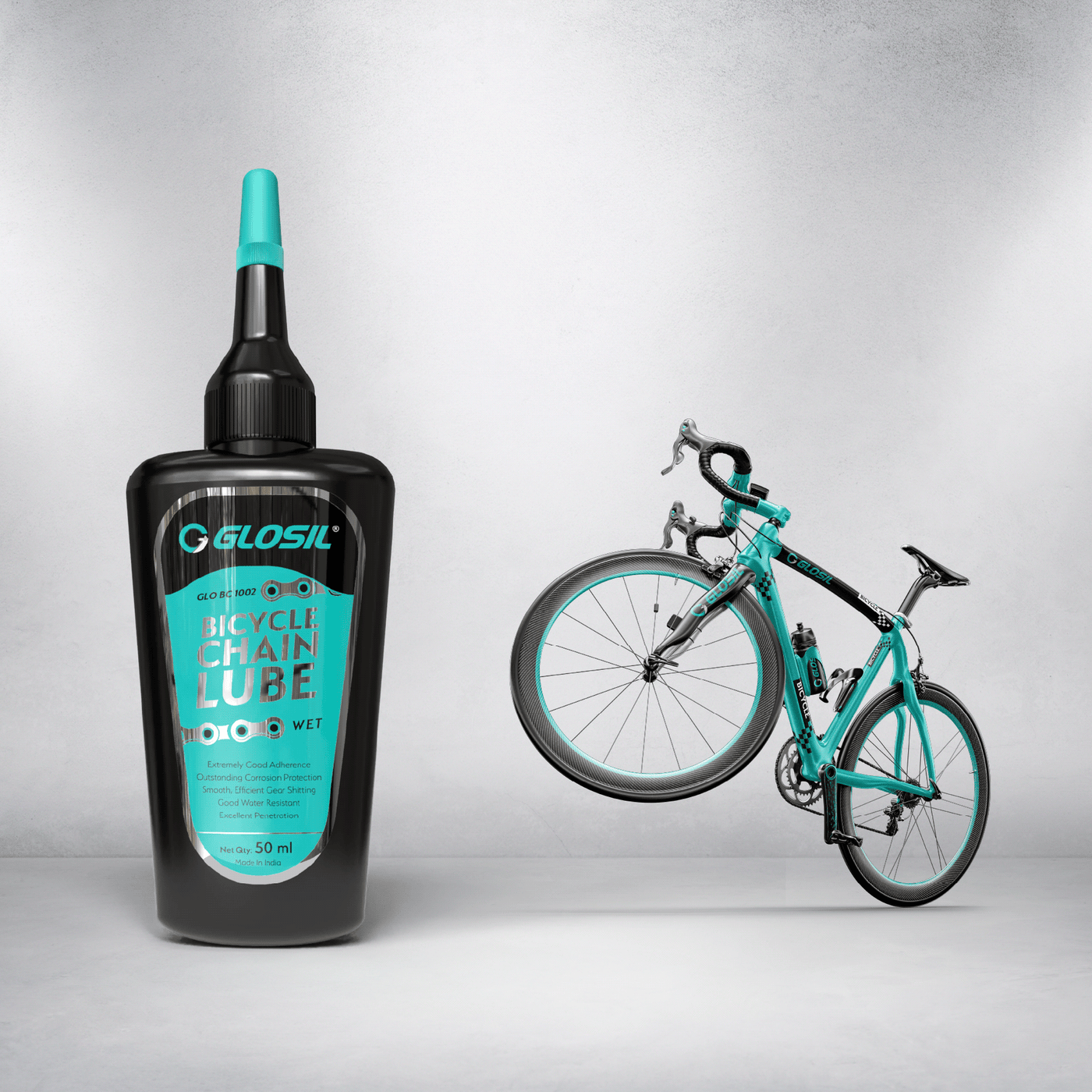 Glosil Bicycle Wet Lube is specially formulated to deliver durable lubrication in wet and harsh riding conditions. Its advanced formula penetrates deep into the chain links and drivetrain components, creating a strong lubricating film that resists water wash-off and heavy use.
